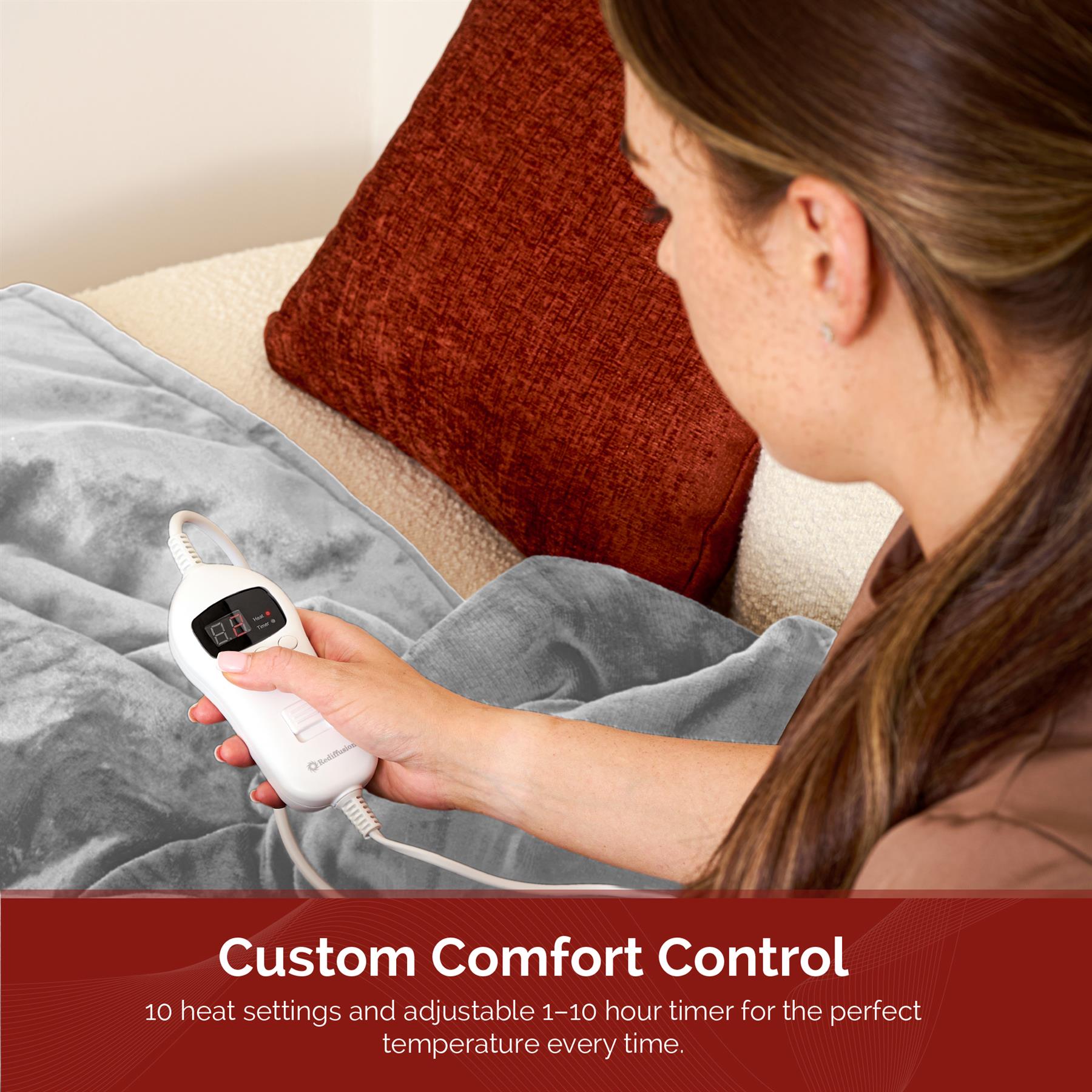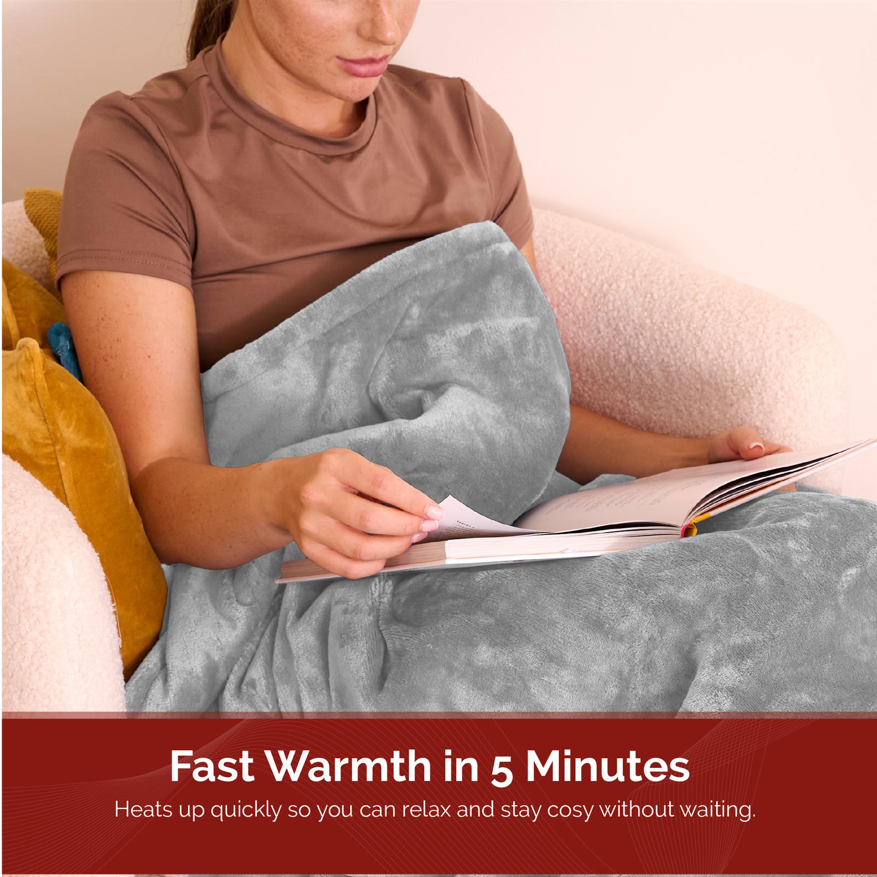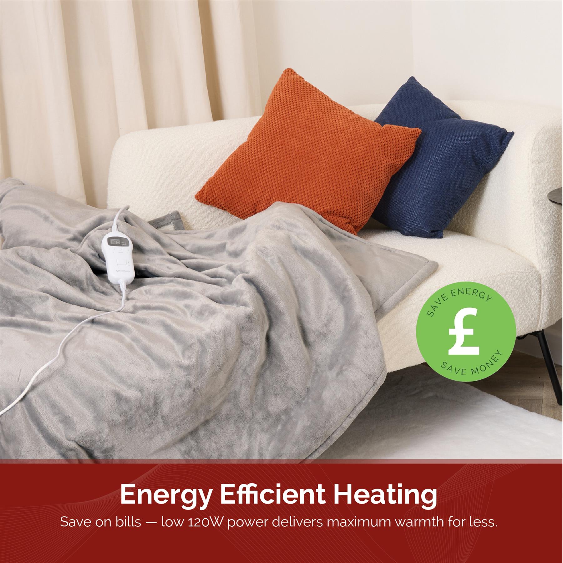 Snuggle up in ultimate warmth and luxury with the CosySnug Luxury Heated Throw in a stylish grey color. Generously sized at 160 x 120 cm, this throw is crafted from a blend of soft flannel and plush teddy fleece, wrapping you in cozy comfort while adding a touch of elegance to your home. Designed for your convenience, the CosySnug throw features detachable controls, making washing hassle-free. The energy-efficient 120W power consumption ensures you stay warm without a spike in energy costs, while the advanced PTC+NTC technology provides fast, consistent heating for immediate comfort. Feel secure with the integrated overheating protection system, providing you with peace of mind as you relax. With a fast 5-minute heat-up time, you'll feel the warmth almost instantly. Adjust the temperature to your liking with 10 heat settings, and customise your experience further with a 1-10 hour timer, complete with heat and pause functions for maximum flexibility. The throw also features an LED control display for easy use and comes equipped with a BS plug for seamless integration into your home. When it comes to cleaning, simply detach the controls and machine wash it at 40°C, keeping your CosySnug throw fresh and ready for use. Whether you’re curling up on the couch or adding an extra layer of warmth to your bed, the CosySnug Luxury Heated Throw transforms any space into a cozy retreat, combining elegance, warmth, and practicality for cold winter nights or anytime you need a little extra comfort.