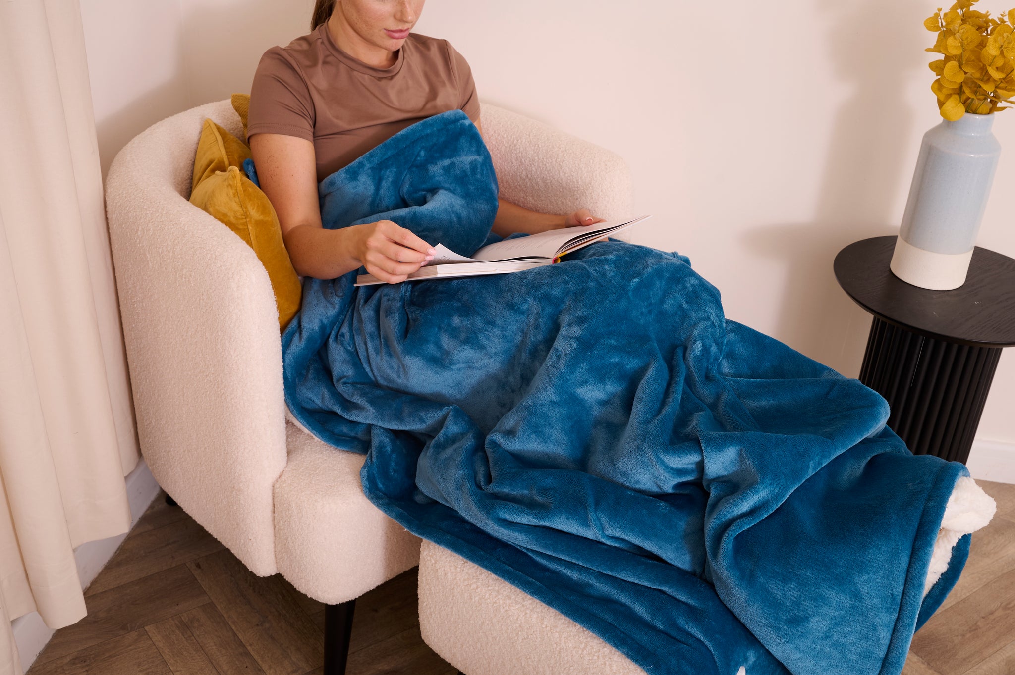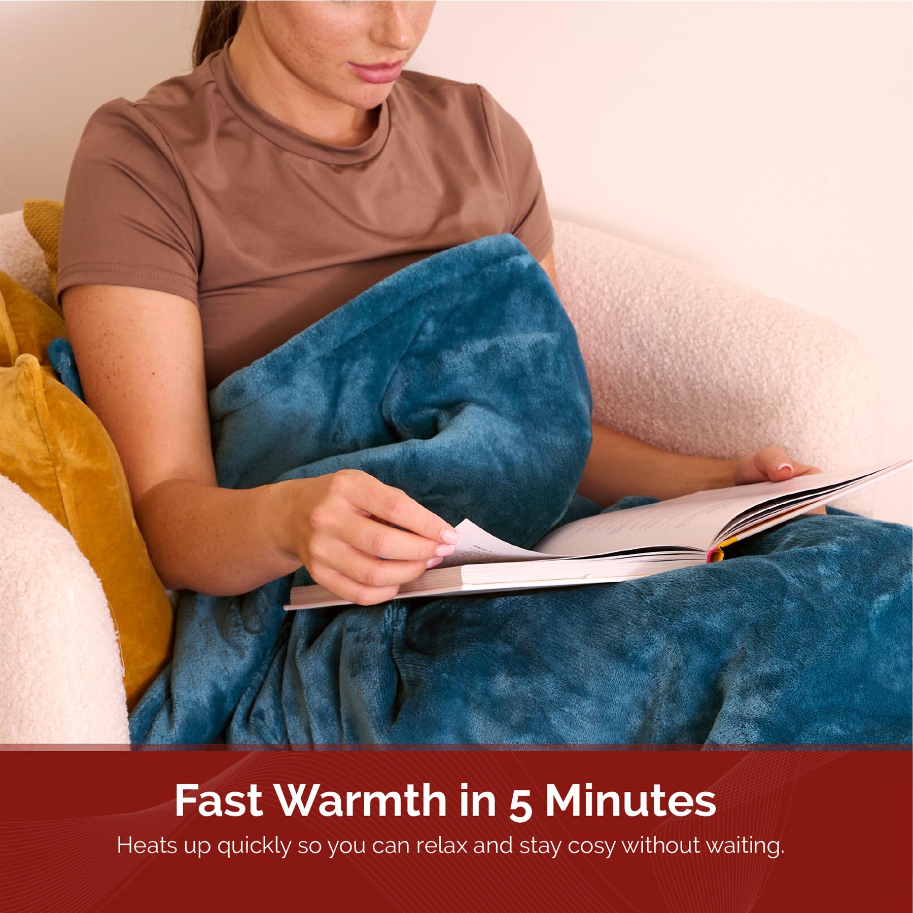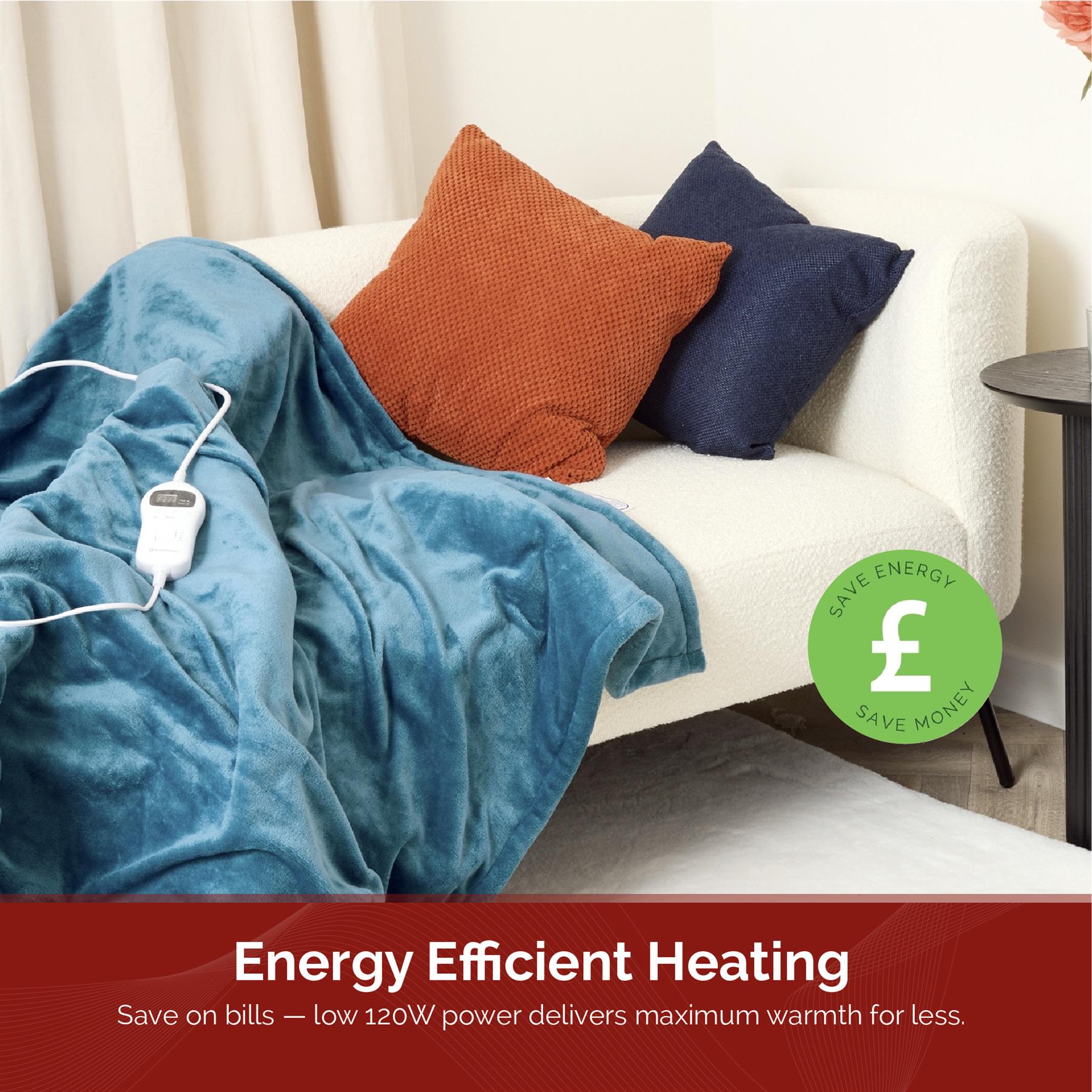 Snuggle up in ultimate warmth and luxury with the CosySnug Luxury Heated Throw in a stylish teal colour. Generously sized at 160 x 120 cm, this throw is crafted from a blend of soft flannel and plush teddy fleece, wrapping you in cozy comfort while adding a touch of elegance to your home. Designed for your convenience, the CosySnug throw features detachable controls, making washing hassle-free. The energy-efficient 120W power consumption ensures you stay warm without a spike in energy costs, while the advanced PTC+NTC technology provides fast, consistent heating for immediate comfort. Feel secure with the integrated overheating protection system, providing you with peace of mind as you relax. With a fast 5-minute heat-up time, you'll feel the warmth almost instantly. Adjust the temperature to your liking with 10 heat settings, and customise your experience further with a 1-10 hour timer, complete with heat and pause functions for maximum flexibility. The throw also features an LED control display for easy use and comes equipped with a BS plug for seamless integration into your home. When it comes to cleaning, simply detach the controls and machine wash it at 40°C, keeping your CosySnug throw fresh and ready for use. Whether you’re curling up on the couch or adding an extra layer of warmth to your bed, the CosySnug Luxury Heated Throw transforms any space into a cozy retreat, combining elegance, warmth, and practicality for cold winter nights or anytime you need a little extra comfort.