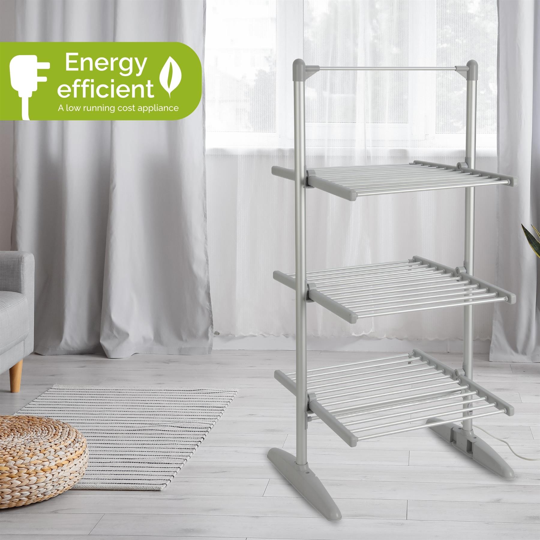 Introducing our 3 Tier Heated Clothes Airer. With its generous capacity boasting 36 aluminium heated drying rails, this airer provides a robust and durable platform for your laundry needs. Offering 21 meters of hanging space, it ensures ample room for all your garments, making it ideal for large loads. Not only does it deliver cost-effective drying with its energy-efficient design, but its compact, slimline construction also neatly folds flat to just 8cm, facilitating effortless storage. Experience fast and efficient drying times thanks to its surface temperature of up to 55°C. Complete with a 1.7m lead and consuming only 300W of power, this airer is perfect for homes seeking a quick, efficient, and space-saving drying solution.